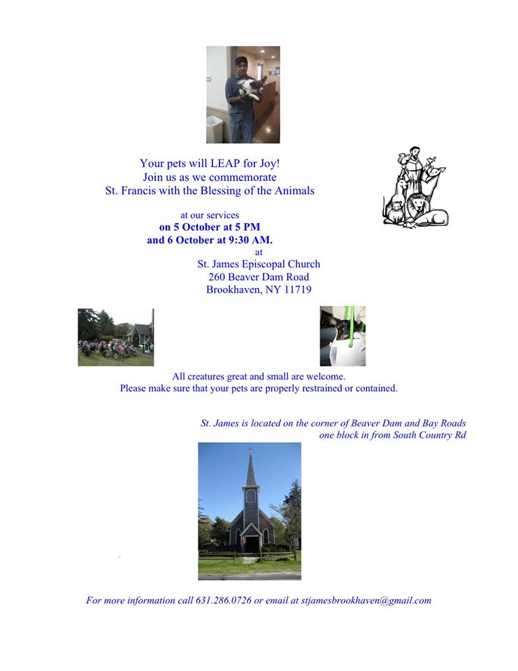 Join us this Saturday at 5 PM and Sunday at 9:30 AM as we commemorate St. Francis with the blessing of Pets and Animals.  All creatures great and small are welcome.  Please make sure your animals are properly restrained or in containers.  If it is not raining, the service will be outside.  Please bring your sweaters and jackets.