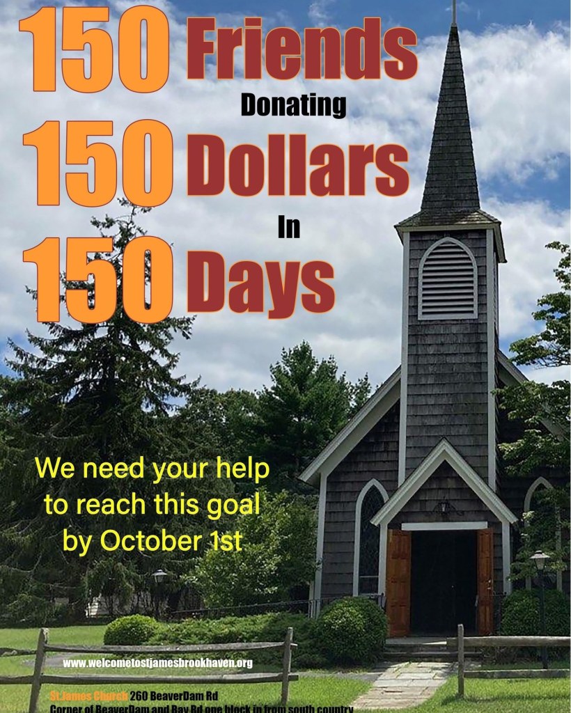 We are trying to get 150 Friends to donate $150 by 1 October and are not close to achieving our goal. A very generous donor has offered to match to the amount of $3000 every pledge we receive now until the end of August. Help us make this campaign a success. Share this information with your friends, former parishioners who are no longer in the area, and anyone who you know who have been touched by the ministry of St. James. You may donate using this link. https://tithe.ly/give_new/www/#/tithely/give-one-time/3376963.